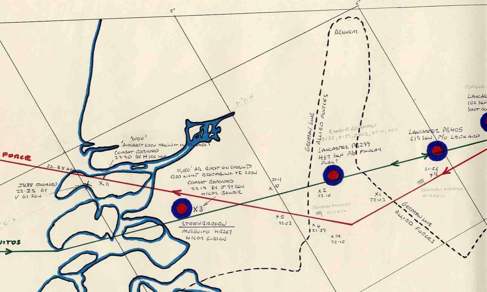 If people have seen these in the past and thought that they refer to more than one plane shot down they are mistaken. The recently discovered full Luftwaffe records for the night show in the words of Theo Boiten that “the 3 JD report clearly states ‘no own losses’; there is no Namentliche Verlustmeldung (Loss Card) of any German NJG loss for this night; and there is not a single piece of evidence that a German night fighter was lost in the SW part of The Netherlands. All crash locations on land in The Netherlands have been carefully documented over the last decades, and I have found nothing about an unidentified crash or even a German night fighter crash in the Provinces of Brabant/Zeeland on 19/20 September 1944.” Clearly if anyone can prove that another aircraft fell in the QR/V / 106/H area on that night this would be the only evidence that could cast real doubt on the friendly fire by QR-V explanation (though it would still leave 97/J’s report that Gibson was definitely shot down at Steenbergen and would not rule out friendly fire from another Lancaster whose crew did not report the fact). However there is absolutely no evidence of that and suggesting that some unidentified, unrecorded aircraft – maybe one of Hitler’s secret flying discs?- crashed without trace in the area on that night is really flying in the face of all the facts.