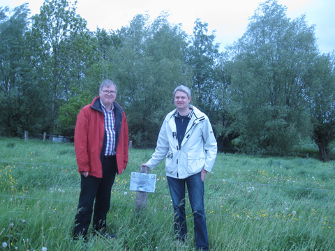 Today I was lucky enough to be shown the site where Norman Barlow’s AJ-E crashed on the Dams Raid, just outside Haldern in the Northern Rhineland area of Germany. My guide was Volker Schurmann, shown (above right) along with your humble scribe, who has been the first person to place a plaque on the site, and who is now campaigning to get a permanent memorial built.
