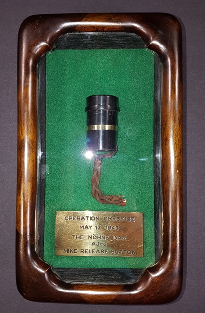 A standard Lancaster bomb release switch is shown here in a well-known wartime publicity photograph. It is claimed that the item for sale is a non-standard one which was removed from aircraft ED906, code letters AJ-J, after the Dams Raid and then given to Ettrick Maltby before David’s death in September 1943. However, in the summer of 1943, ED906 was still being used by 617 Squadron for test drops of the Upkeep weapon and therefore its bomb release switch should still have been in place.