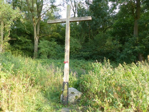The track bends left and right around the corner of the wood – amongst the trunks of two trees on the left, there are the remains of a wooden structure of some description. Follow the line of the wood on your right for about 200 yards and the wooden cross is on your right in front of the crater created when the Upkeep exploded on impact.