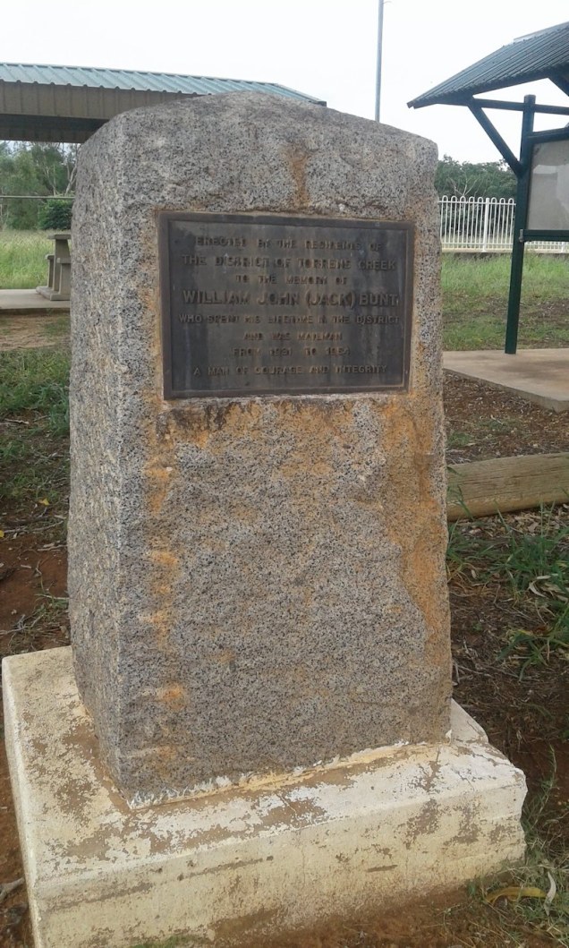 This monument in Torrens Creek remembers Jack Bunt, “A man of courage and integrity,” the local mailman whose long, lonely route took him every Monday to Bannockburn, where he delivered the letters Charlie Williams was writing home. The fence beyond marks the site of the railroad station from which Charlie left to report to the RAAF.