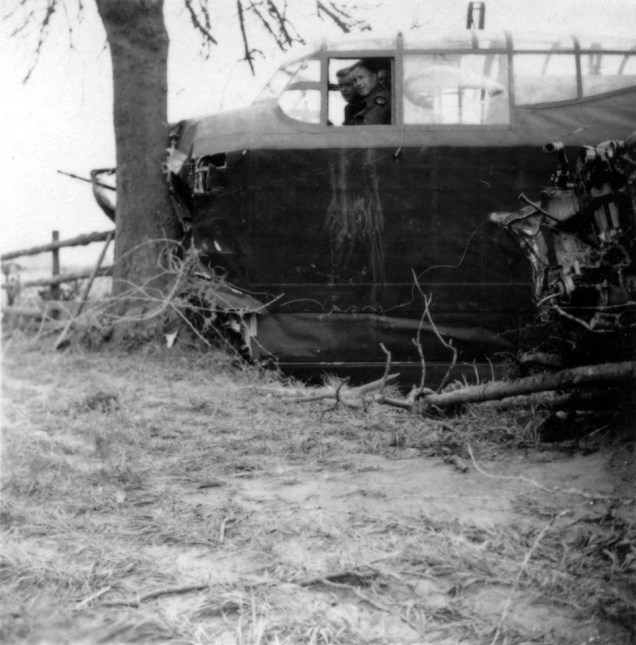 We touched down onto the grass, we bounced, bounced once again but just couldn’t slow down enough. The runway finished up near a corner and there was a gun emplacement there, and as we tore along, they all jumped out of the gun emplacement. We crossed over one road, a field, another road and then into another field, and finally ended up with our nose against a tree. Fortunately, as no front gunner was allowed in the front turret during landing, I’d already got out from there – just as well, because my front turret was absolutely mangled.