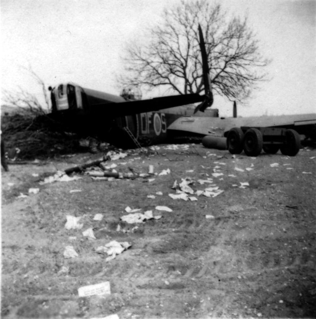 The next morning, the five of us (David, George, Max, Eric and myself) went and viewed our aircraft. As I said previously, David was living out at Woodhall Spa with his fiancée at some relatives or friends of hers, [actually his fiancée’s sister – CF] and he had the use of their car. So he drove to the station and picked us four up, and we went and viewed the wrecked aircraft in daylight. It had been brand-new just the previous day. S for Sugar (we didn’t call it S for Sugar though).