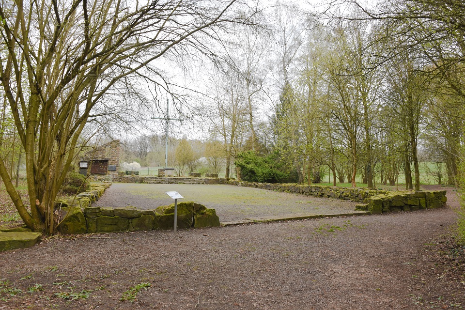 Driving from the Möhne Dam to the crash site leads along the Möhne river. After 3 miles down river on the left side is another monument related to the Dams Raid – the Himmelpforten monastery memorial. Himmelpforten means “Heaven’s gate”. The monastery was literally washed away by the flood wave caused by the breach of the dam. If somebody is planning a road trip along the Dams Raid sites, it is worth a stop. Central part of the monument are the foundation walls of the monastery´s church. Except for a small wall, the church was destroyed. It is said that the flood wave at this place was 13 yards high. Pastor Joseph Berkenkopf heard the explosions of the upkeep mines and the roar of the wave. To him it was clear that the dam had been breached. Attempting to warn his little community he rushed up the church tower and rang the bells until the flood reached Himmelpforten and he was washed away together with his church. His gravestone is today part of the monument.