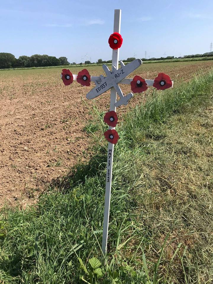 If you stand with your back to the memorial, at 2 o’clock, you will see an electricity pylon – it is conceivable that the 1943 version of this finally brought down the Lancaster which crashed in the field behind the memorial.