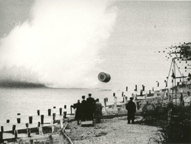Barnes Wallis had never been back to Reculver in Kent, the place where the final test drops of his “bouncing bomb” took place in May 1943, until he was taken there by Ray Hepner in 1976. Above, in this previously unpublished photograph taken by Ray and kindly given to me by him, he surveys the scene. Below is a still from the film sequcnce shot of the tests, now in the Imperial War Museum. Wallis is the bareheaded figure on the far left of the group. In the film, he is seen to be waving his arms as if to urge the bomb onwards.