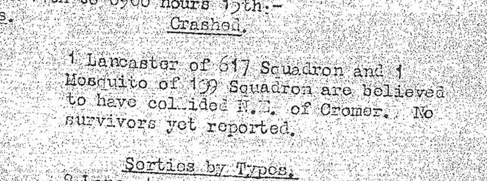 1 Lancaster of 617 Squadron and 1 Mosquito of 139 Squadron are believed to have collided N.E. of Cromer. No survivors yet reported.