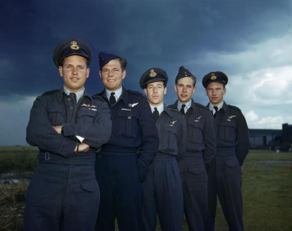 Five of Gibson’s Dams Raid crew, photographed at Scampton in July 1943. Left to right: Guy Gibson, Fred ‘Spam’ Spafford, Robert Hutchison, George Deering, Harlo ‘Terry’ Taerum. Note the three shades of uniform colour: Gibson and Hutchison in RAF blue, Deering and Taerum in a darker RCAF shade, and the deepest of all, the RAAF outfit worn by Spafford. [Pic: IWM TR1127]