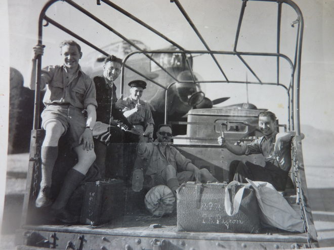 Five of Les Munro’s crew from the Dams Raid, photographed two months later, at RAF Blida in Algeria. L-R: Bill Howarth, gunner; Harvey Weeks, gunner; Grant Rumbles, navigator; Jimmy Clay, bomb aimer, with a damaged nose caused by bomb fragments; Percy Pigeon, wireless operator. [Pic: Howarth family]