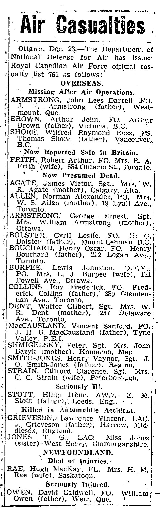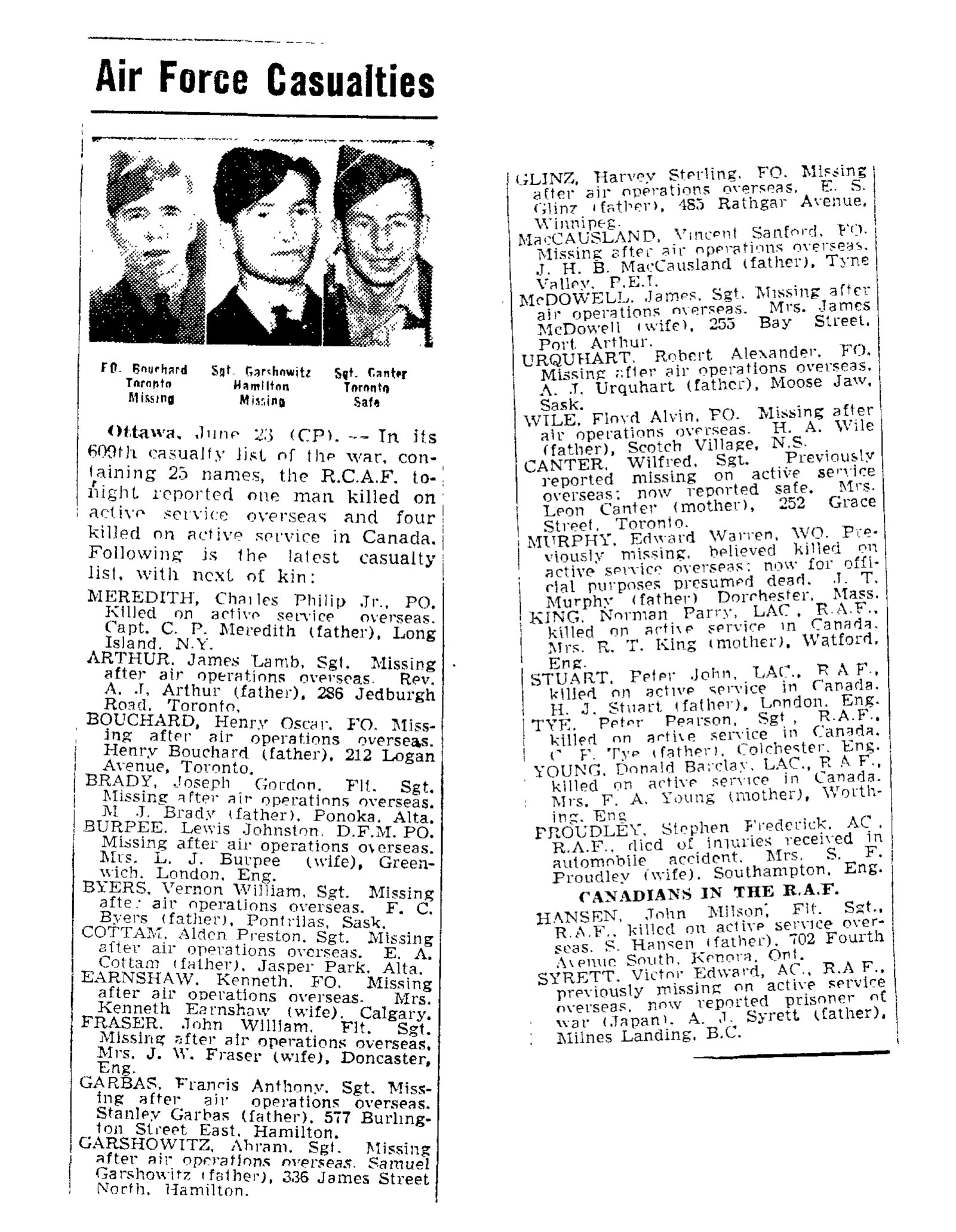 Two more contemporary items are shown here. These are the missing and death notices published in the Toronto Globe and Mail. The first of these, from June 1943, gives the names of all the Canadians who went missing on Operation Chastise (including John Fraser, who was later discovered to have baled out and been sent to a PoW camp). The second, from December, gives the list of those confirmed dead.